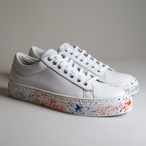 Illustration of Air Force One sneakers transformed by Prince's flair: white base with deep purple overlays, adorned with subtle paisley patterns and a hint of ruffle. A tasteful blend of simplicity and Prince's unmistakable elegance. --s 750 --v 5.2 --style raw