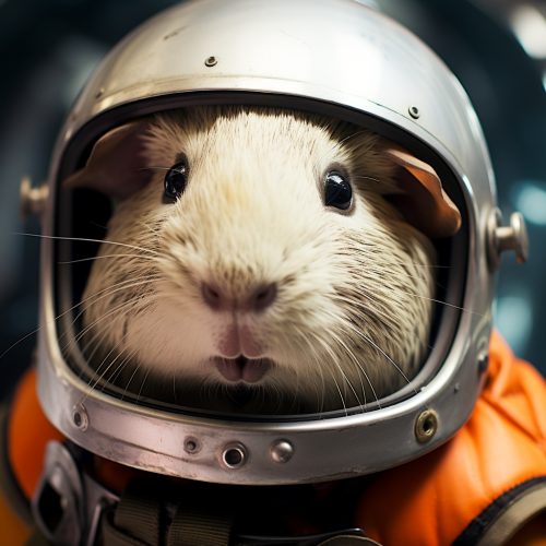 guinea pig with crash helmet and silver astronaut test flight suit