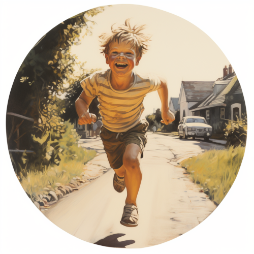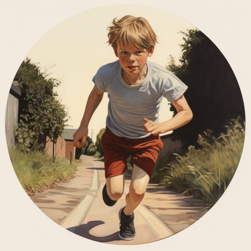 boy jogging on a small circular road, smyling with a grind on his face