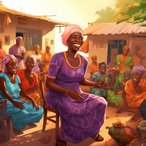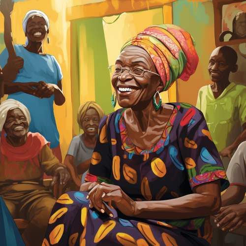 a Guinean grandmother seated at a party in the village center cartoon style.