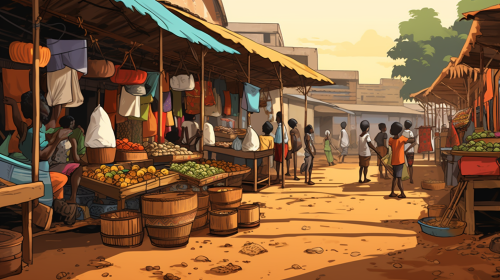 A woman with peanuts in her hands stands next to a vegetable stand in a Guinean market. cartoon style.