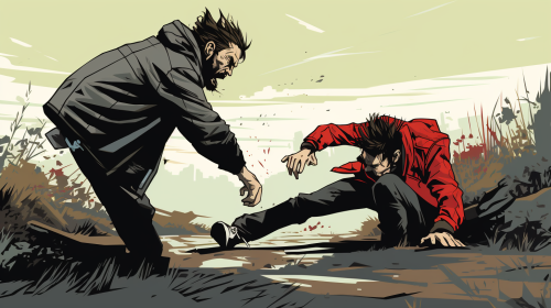 black, white and red illustration, anime style, flat colors high-resolution image grass hoper fighting with homeless guy with accent color fe5115 --ar 16:9