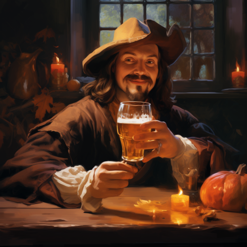 Guy Fawkes holding an amber colored beer, sitting at table, digital painting