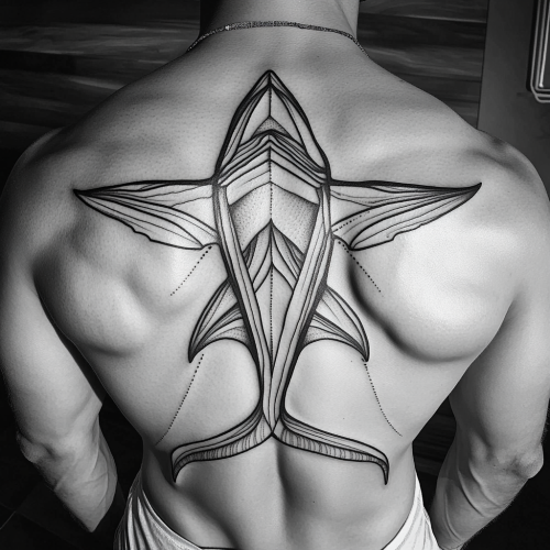 Black and white neo-traditional tattoo design of a shark viewed from above, covering the entire back. The shark has a streamlined body with defined fins and tail. Bold, clean lines outline the figure, with intricate shading to create depth and texture. Incorporate traditional neo-traditional elements such as bold contrasts, detailed line work, and smooth gradient shading. The design should be dynamic and powerful, with a sense of movement and fluidity, filling the entire back canvas