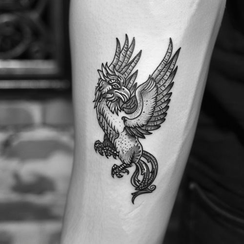 a black and white tattoo in the style of a griffin brand cigar box logo. --v 6.0