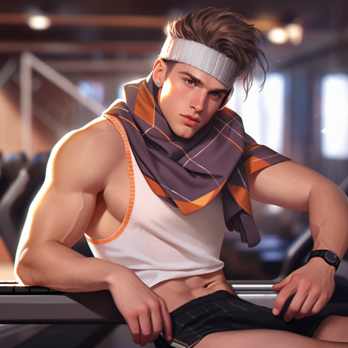 ?️?, handsome athletic man on the treadmill at the gym, sleeveless, defined abs, lots of personality, sweatband, inspired by kj apa and adam rippon and casey cott, colorful, style of bruce weber, kadir nelson, zach lynch, greg gorman, jc leyendecker, photorealism, vector --niji 5