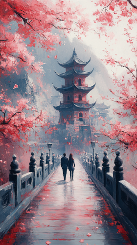 two people walk the bridge under a large cherry blossom, in the style of atmospheric paintings, gray and aquamarine, airbrush art, dark white and dark gray, lovely --ar 9:16 --style raw --stylize 750 --v 6.1