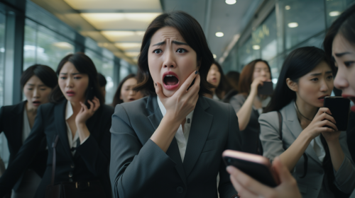 a japanese group of woman business trying call her friends and panicked because her friends not answering, clear skin texture, hyper detailed, fine detailes, ultra realism, full body shot, captured with Sony alpha A7 III camera with Sony FE 24 - 105mm f/ 4 G OSS Lens, 8K, --ar 16:9