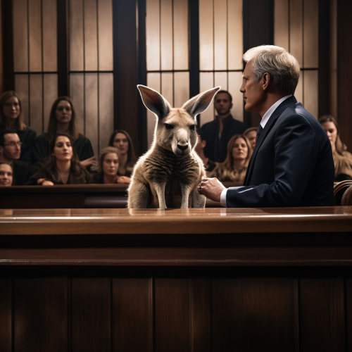 HD 4K photorealistic movie scene. A kangaroo court. The judge is a kangaroo, the jury are all kangaroos. Standing trial is donald trump