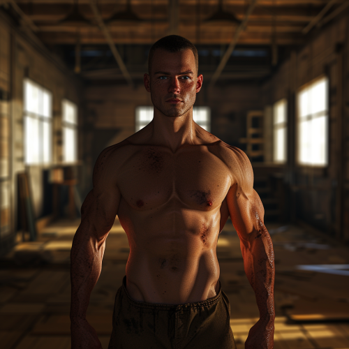 Character sketch illustration page with multiple poses, figure study, brown ink - of John Krasinski with a beard and messy hair, broad shoulders and muscular build, with a stoic expression that is almost angry, wearing leather suspenders a long sleeve shirt with the sleeves rolled up to expose his forearms, protective stance - 1920s themed, no colors