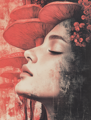 Half-length portrait of woman with surrealistic style.