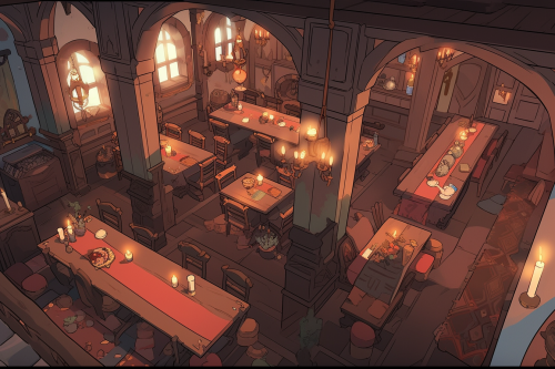 Dnd town inn, in the style of dnd locations, interior shot, lounge and bar, mythcore, rural europe - inspired, cross processing, candlelight, evenign hours, extremely detailed --ar 3:2 --niji 5