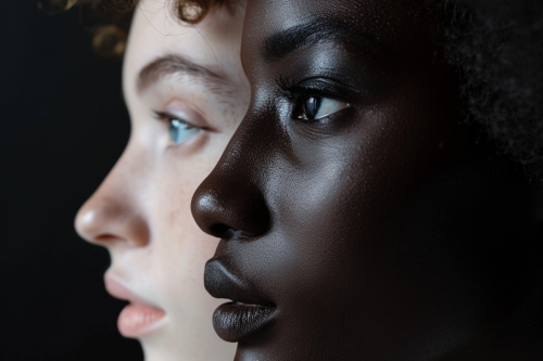 beauty portrait of half black half white, white side on black background and black side on white backgroud --ar 3:2 --v 6.0 --style raw