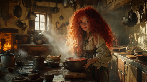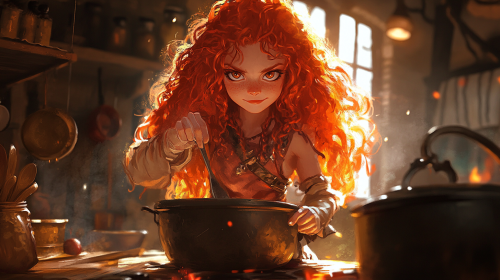 small furious barbarian halfling, with long red curly hair, cooking in kitchen, medieval kitchen warm light, intense expression, wearing barbarian clothes, angry expression, cute face, style of video game concept art, --ar 16:9