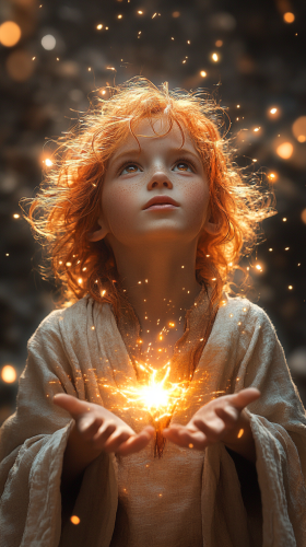 dungeons and dragons character portrait, halfling paladin casting a spell, bright orange hair, boisterous and victorious, cinematic grading, --ar 9:16 --s 750