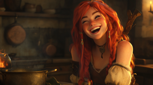 red haired barbarian halfling, laughing, whilst happily cooking in a medieval kitchen, wearing barbarian clothes, cute face, style of video game concept art, midshot, soft warm lighting, --ar 16:9