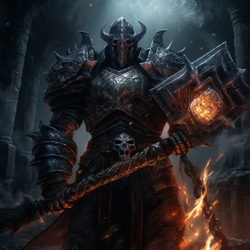 dark corrupt medieval paladin holding a giant hammer pulsing with dark energy, enhanced weapon, enhanced armour, dark fantasy, dark atmosphere, high detail, high quality, complex design