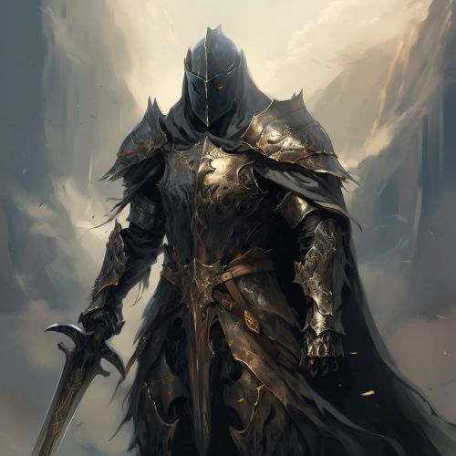 a holy warrior paladin, serving a god of war, steel plate mail, glaive weapon, black cloak, helmet, dnd, dark fantasy, medieval
