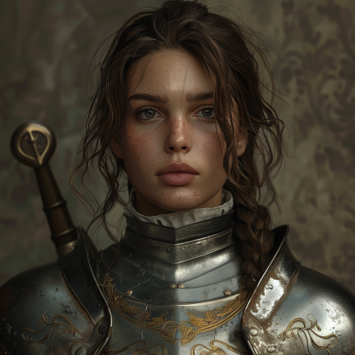 female halfling, full body, short curly red hair and silver eyes, freckled cheeks, medium adventurer style leather and metal armor, glowing dwarven runes, shield on her left hand and a sword on her right hand, hero fighting pose, fantasy background, realistic illustration --ar 4:5