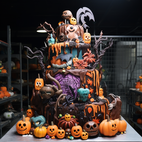 Create a very tall multi tiered novelty cake of a haunted Victorian Mansion on a hill. Spooky trees. A staircase case that leads up to the mansion. Pumpkins and Ivy and fall leaves and sunflowers. Roses in orange and burgundy red and yellow. There are Bright Halloween Themed cupcakes and macarons neatly placed around the base of this cake design. This cake is displayed on a dessert table that has layers of ruffled black satin tablecloth. There is a special effect fog smoke machine creating swirls of smoke around The base of the cake. The background has curtains. This room is a ballroom with guest tables decorated for a fun and elegant Halloween Ball. --ar 4:5 --v 6.1 --stylize 300