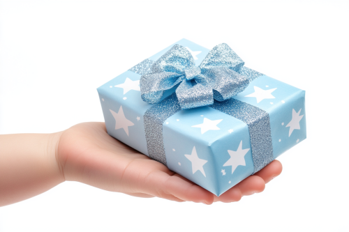 Front view, Close up of a hand of a young child offering a gift isolated on white background. The gift is light blue with white stars with a big beautiful bow. Hyper realistic, hyper detailed. Stock photo. Highest quality. Created by art director. --ar 3:2 --style raw --v 6.1