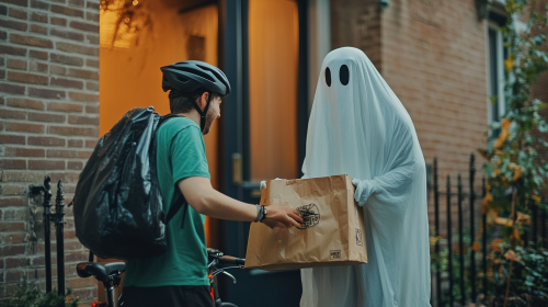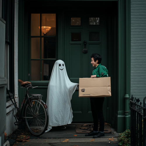 Movie still, documentary photography, editorial, in the style of Martin Parr: A delivery scene where a person dressed as a ghost for Halloween, wearing a white sheet with holes cut out for the eyes, is smiling as they receive a food delivery from an Uber Eats delivery person standing at the front door. The delivery person, wearing a green and black uniform with a large square Uber Eats bag on their back, hands over a brown paper bag with the Uber Eats logo. A bicycle is parked nearby, leaning against the dark green wooden door. The atmosphere is casual and friendly, with Halloween decorations subtly in the background. High level of detail, realistic lighting, street style, 35mm.