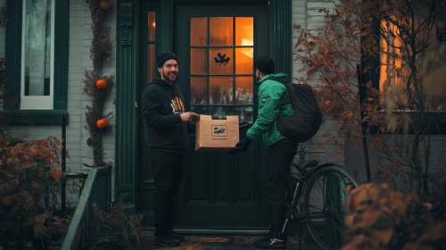 Movie still, documentary photography, editorial, in the style of Martin Parr: A delivery scene where a person dressed as a ghost for Halloween, wearing a white sheet with holes cut out for the eyes, is smiling as they receive a food delivery from an Uber Eats delivery person standing at the front door. The delivery person, wearing a green and black uniform with a large square Uber Eats bag on their back, hands over a brown paper bag with the Uber Eats logo. A bicycle is parked nearby. The atmosphere is casual and friendly, with Halloween decorations subtly in the background, cinematic orange halloween light, 35mm, intricate details --ar 16:9