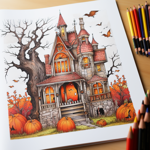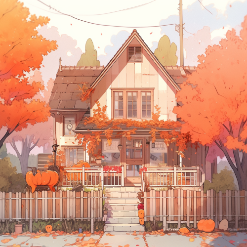 studio ghibli style, simplistic, simple anime, soft lines, fall colors, drawing style, coloring book, wide shot of a house with Halloween decorations. --niji 5
