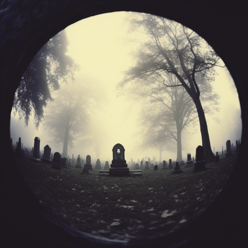 An eerie Halloween poster background. Foggy cemetery. Fisheye lens. Midnight. Vintage black and white photograph. Kodak Tri-X film.
