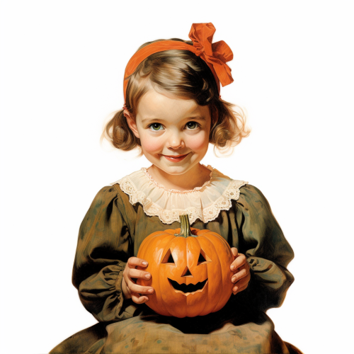 a pretty little girl holding a jack-o-lantern. Norman Rockwell 1920s Saturday Evening Post cover. White background.