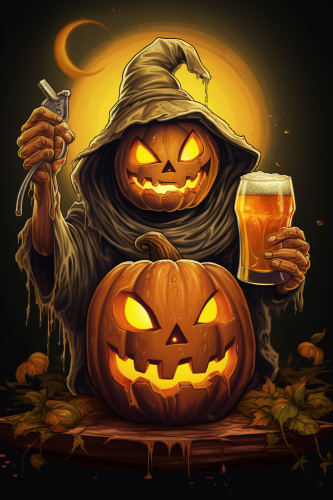 A Halloween pumpkin transformed into a tropical cocktail, with a carved jack-o'-lantern face, colorful tropical drink elements like fruit slices, tiny umbrellas, and bamboo straws poking out. The pumpkin-cocktail is set in a dark, misty jungle filled with exotic plants, eerie vines, and a mysterious glow. Bats fly above, and fog drifts through the dense greenery, creating a spooky yet festive Halloween atmosphere in the heart of the jungle