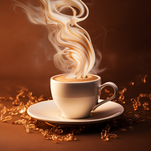Illustrate a cozy café scene with steaming cups of coffee and intricate latte art. Use warm tones and swirling patterns to evoke the comforting ambiance of a coffee shop.