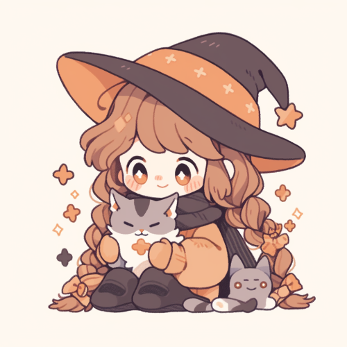 an adorable chibi witch with light brown hair amber eyes holding tarot cards with a ragdoll cat, in the style of winter pastel, white background, simple character illustration, Doodle, superflat style illustration, strong linear elements, minimalist --s 250 --niji 5