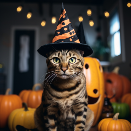short hair small orange cat with dressed as a witch on Halloween spooky --s 65 --weird 100