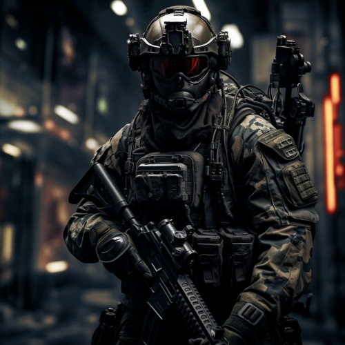 Full body, anthropomorphic lion with an incredibly realistic military appearance, featuring a detailed tactical uniform, muscular physique, and a military cap. The lion is armed with a sophisticated automatic rifle slung across its chest, exuding strength and confidence. The scene is set in a military environment, with the lion confidently walking forward, his entire body, including both feet, clearly visible. The background features blurred military vehicles, soldiers, and a helicopter in flight, with the American flag waving. Soft, warm lighting highlights the lion, enhancing the intense and powerful atmosphere of a military operation. The details of the lion's fur, muscles, and gear are vivid and textured, making the image feel real and imposing. --ar 16:9 --v 6.1