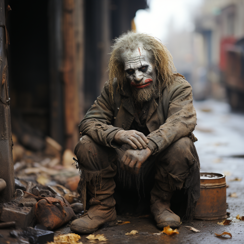 Gangster Clown Hyperrealistic, Gangster, Clown, Smoking a Cigar, Shot of whiskey, looks like arthur morgan as a clown, clown nose, clown face paint