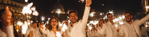 A group of people in white attire, holding sparklers and celebrating the New Year at an outdoor event on Place de la Concorde in Paris during the nighttime. The scene captures their joyous expressions as they dance around with sparkling lights illuminating them against the backdrop of historic buildings. --ar 4:1