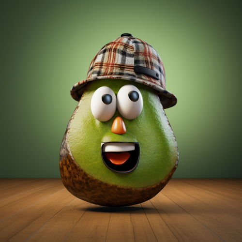 an avocado with “mr potato head” face, wearing a Burberry baseball cap