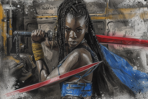 a hand drawn charcoal sketch of a strong. beautiful, young African American woman with long braids, red sword, blue kente cloak, fighting in a futuristic weapons depot, industrial, gritty, dystopian future --ar 3:2 --v 6.0