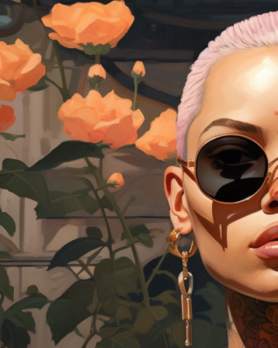 gorgeous girl with shaved head, sunglasses, silver nose piercing and long earrings and arm tattoos, holding a flower::3, street cafe in the background, painting by Paula Modersohn-Becker, Josan Gonzalez, Jim Fitzpatrick, in the style of moody tonalism, avant-garde symbolist editorial, visible pores and lines, dynamic, expressive, action shot --v 5.2 --c 7 --ar 4:5