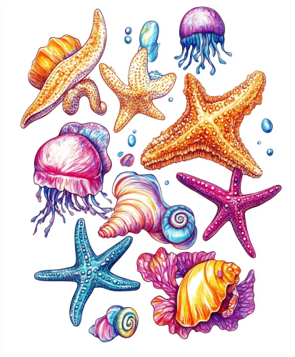 hand drawn hand-drawn in colored pencil, in the style of Nickelodeon cartoons, white background three color limit, starfish, jellyfish, snails, and drawn to appeal to twelve year old children, t shirt design --ar 5:6