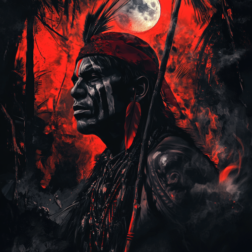 hand drawn style image with dominant black and red colors, highlighted, native Brazilian Indian man, black paint on his face, powerful spiritual white eyes, red cap on his head, spiritual black and red necklace, holding an ancient club, walking inside a dense forest while the earth cracks in half, fire and moon in the background, spiritual atmosphere, hand drawn style, focus on black and red colors, focus on every detail, sharp details, high quality, high quality graphics, 4k, artstation --v 6.1