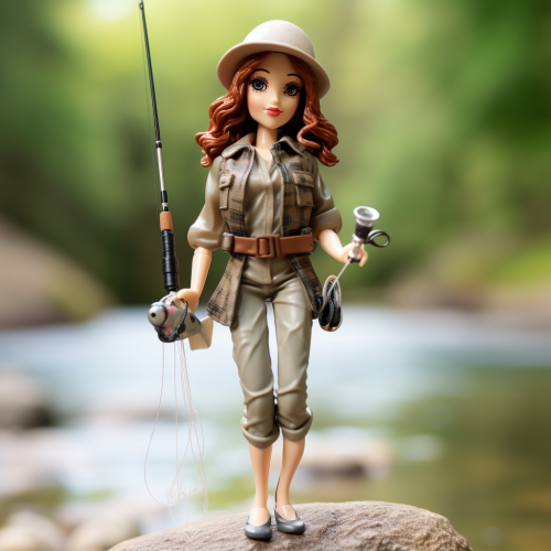 plastic doll, fly fishing woman, outdoor hipster, doll is wearing fly fishing waders, holding a fly fishing rod, on a river, rubber doll texture, outdoor, product photo, realistic, ultra high resolution