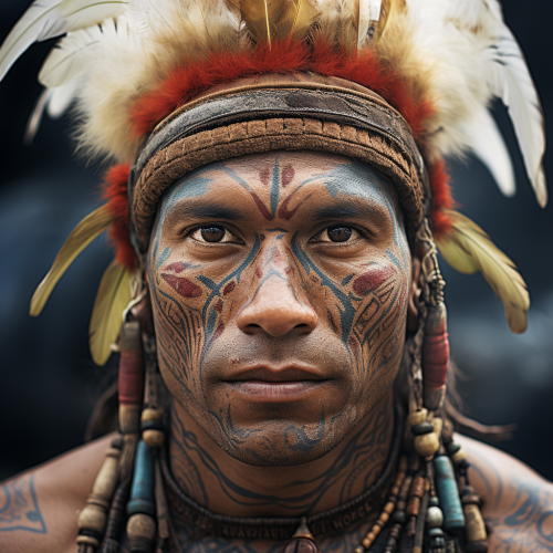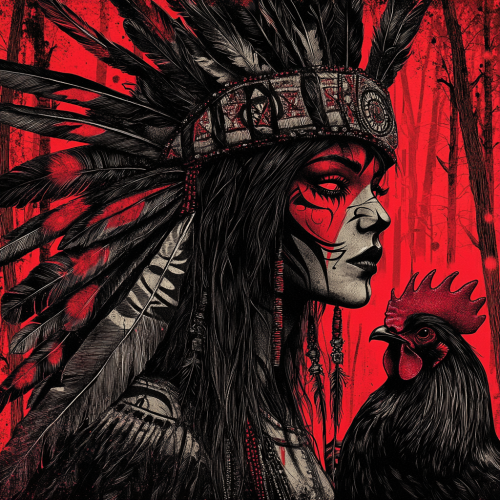hand drawn style image with dominant black and red colors, highlighted, spiritual being, native Brazilian Indian woman, long hair, headdress with black and red feathers, black painted face, spiritual red eyes, black rooster by her side, inside a forest, spiritual atmosphere, hand drawn style, focus on every detail, sharp details, high quality, high quality graphics, 4k, artstation --v 6.1