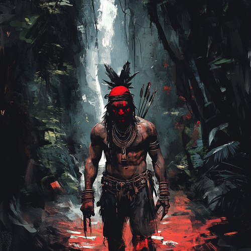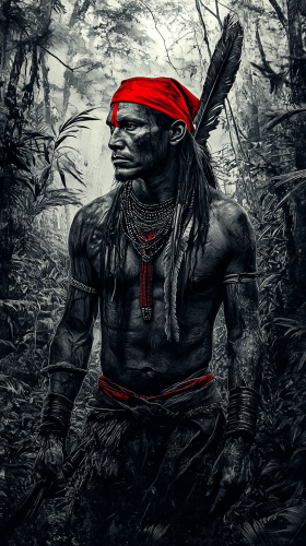 hand drawn style image with dominant black and red colors, highlighted, native Brazilian Indian man, red cap on his head with two ears up like a feline, spiritual black and red necklace, holding an axe, inside a closed forest, spiritual atmosphere, hand drawn style, focus on black and red colors, focus on every detail, sharp details, high quality, high quality graphics, 4k, artstation --v 6.1 --ar 9:16
