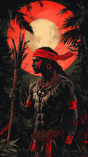 hand drawn style image with dominant black and red colors, highlighted, native Brazilian Indian man, black paint on his face, powerful spiritual white eyes, red cap on his head, spiritual black and red necklace, holding an ancient club, walking inside a dense forest while the earth cracks in half, fire and moon in the background, spiritual atmosphere, hand drawn style, focus on black and red colors, focus on every detail, sharp details, high quality, high quality graphics, 4k, artstation --v 6.1