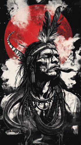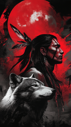 hand drawn style image with dominant black and red colors, highlighted, native Brazilian Indian man, long hair with feather holding his hair, next to a huge wolf, moon in the background, spiritual atmosphere, hand drawn style, focus on black and red colors, focus on every detail, sharp details, high quality, high quality graphics, 4k, artstation --v 6.1 --ar 9:16