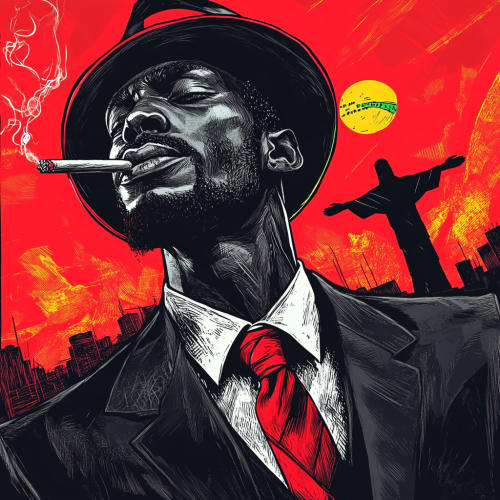 hand drawn image with dominant black and red colors, highlighted, black man, black hat with red ribbon, black suit with red tie, smoking cigarette, drinking beer, dancing inside a favela in Brazil, Brazilian flag in the background, spiritual atmosphere, hand drawn style, focus on black and red colors, focus on every detail, sharp details, high quality, high quality graphics, 4k, artstation --v 6.1