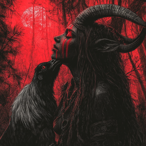 hand drawn style image with dominant black and red colors, highlighted, spiritual being, native brazilian indian woman, long hair, black painted face, spiritual red eyes, raising the head of a goat with large horns, black rooster by her side, inside a forest, spiritual atmosphere, hand drawn style, focus on every detail, sharp details, high quality, high quality graphics, 4k, artstation --v 6.1