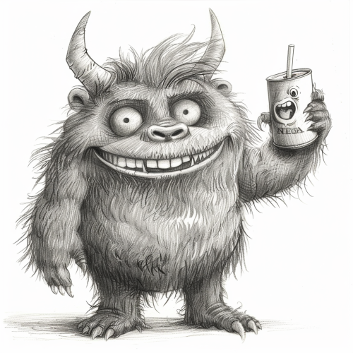 cartoon style, hand drawn, grey pencil on white paper, a smiling hairy monster, holding a can of brazilian soft drink guarana --v 6.0 --chaos 10
